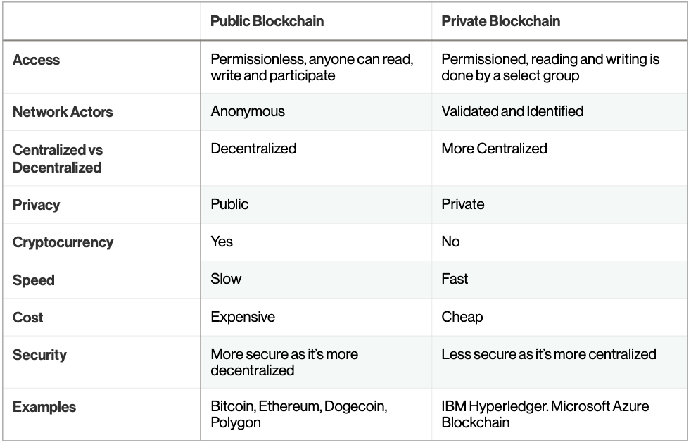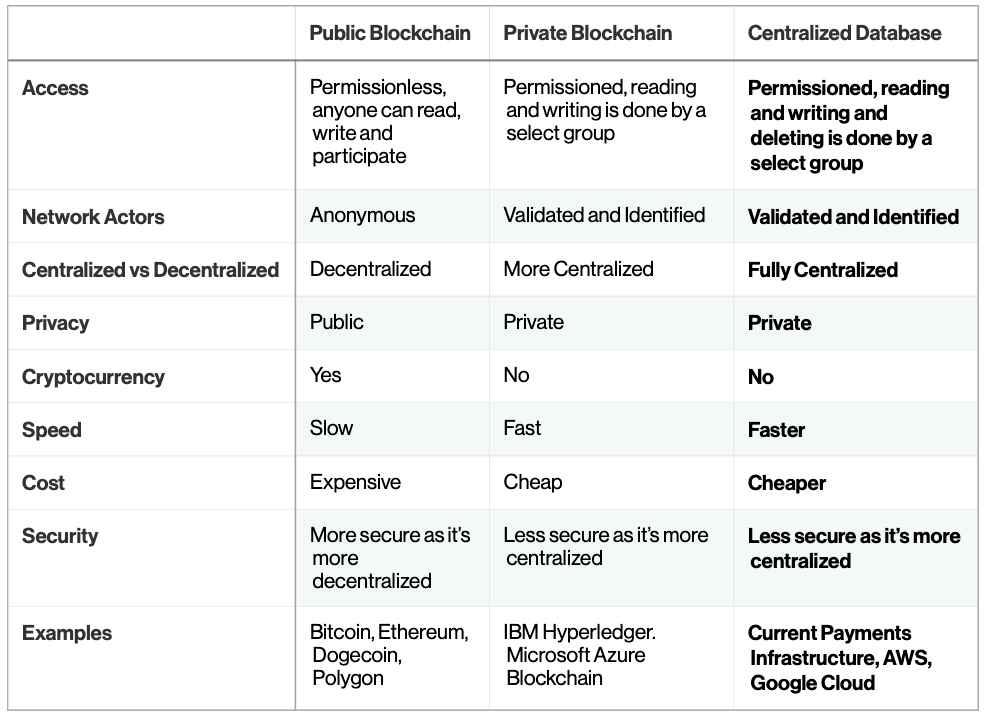 Table 2: Public Blockchain vs. Private Blockchain vs. Centralized Database